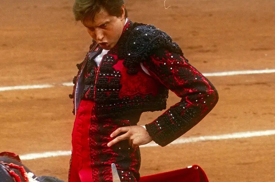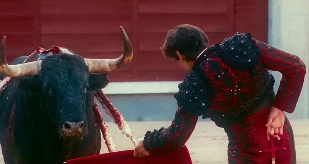 而对Andrés的身体,塞拉也保持同样的凝视。影片中在斗牛中,他曾两次差点被牛角顶翻,遭遇生命危险。他被牛角顶翻,然后倒在地上,牛用蹄子狠狠的踩在Andrés的身上,但所幸在助手的帮助下,他都最终成功脱困。